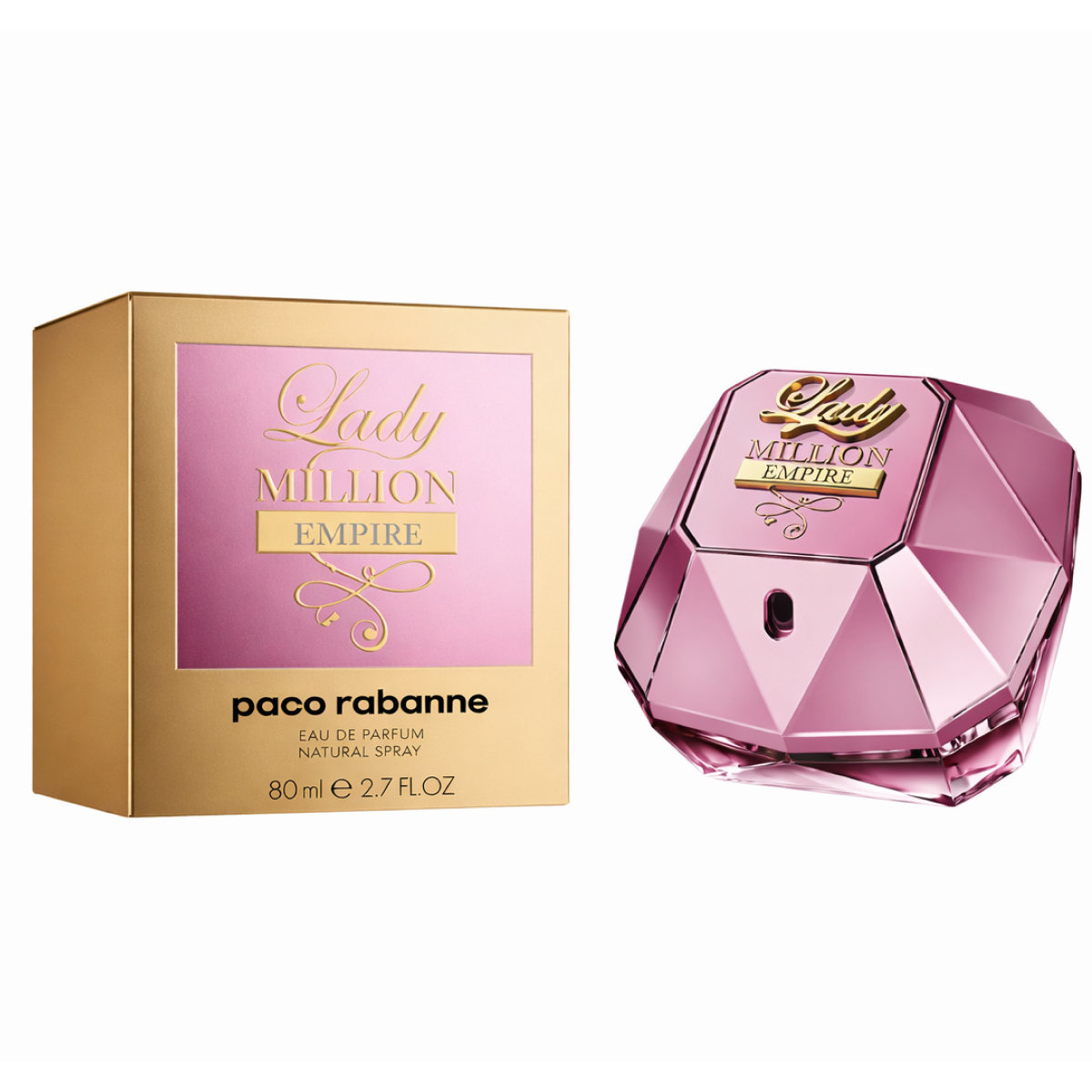 Paco Rabanne - Lady Million Empire - Eau de Parfum pour femme. Lancée en 2019 et créée par les parfumeurs Anne Flipo et Jean-Christophe Hérault, cette fragrance est la première de la collection à explorer des facettes chyprées. Elle incarne une féminité conquérante, celle d'une femme qui bâtit son propre empire. Le flacon diamant signature délaisse l'or pur pour un dégradé de rose précieux et de touches dorées. C'est un parfum Chypré Floral audacieux et résolument moderne.